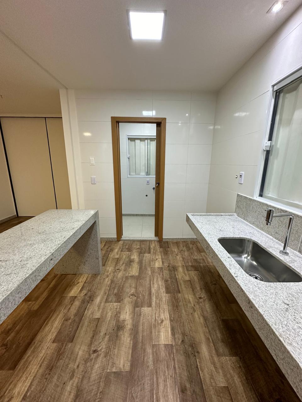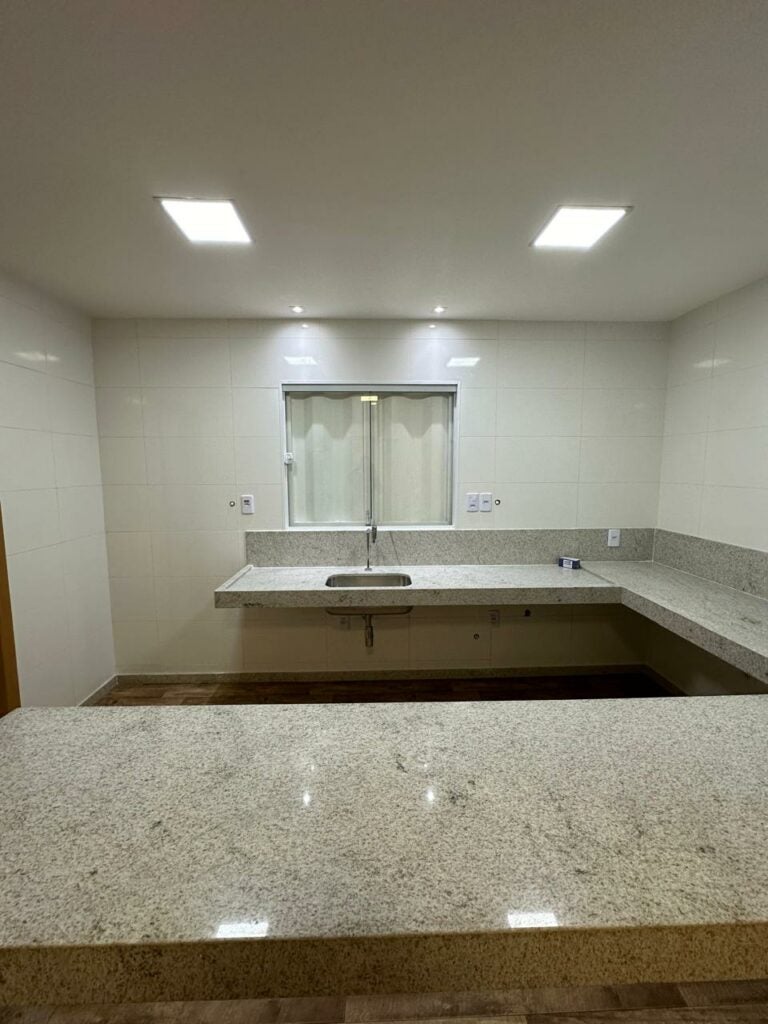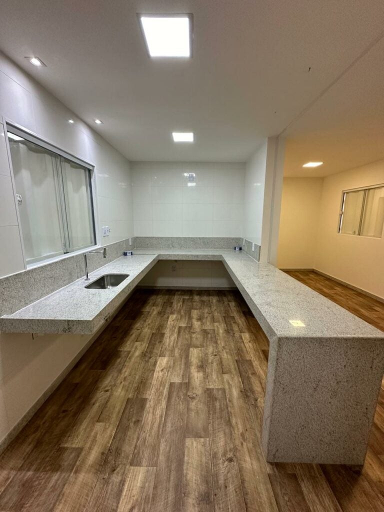 Bancadas: Cozinha e banheiros equipados com bancadas em granito Branco Siena, valorizando o ambiente.