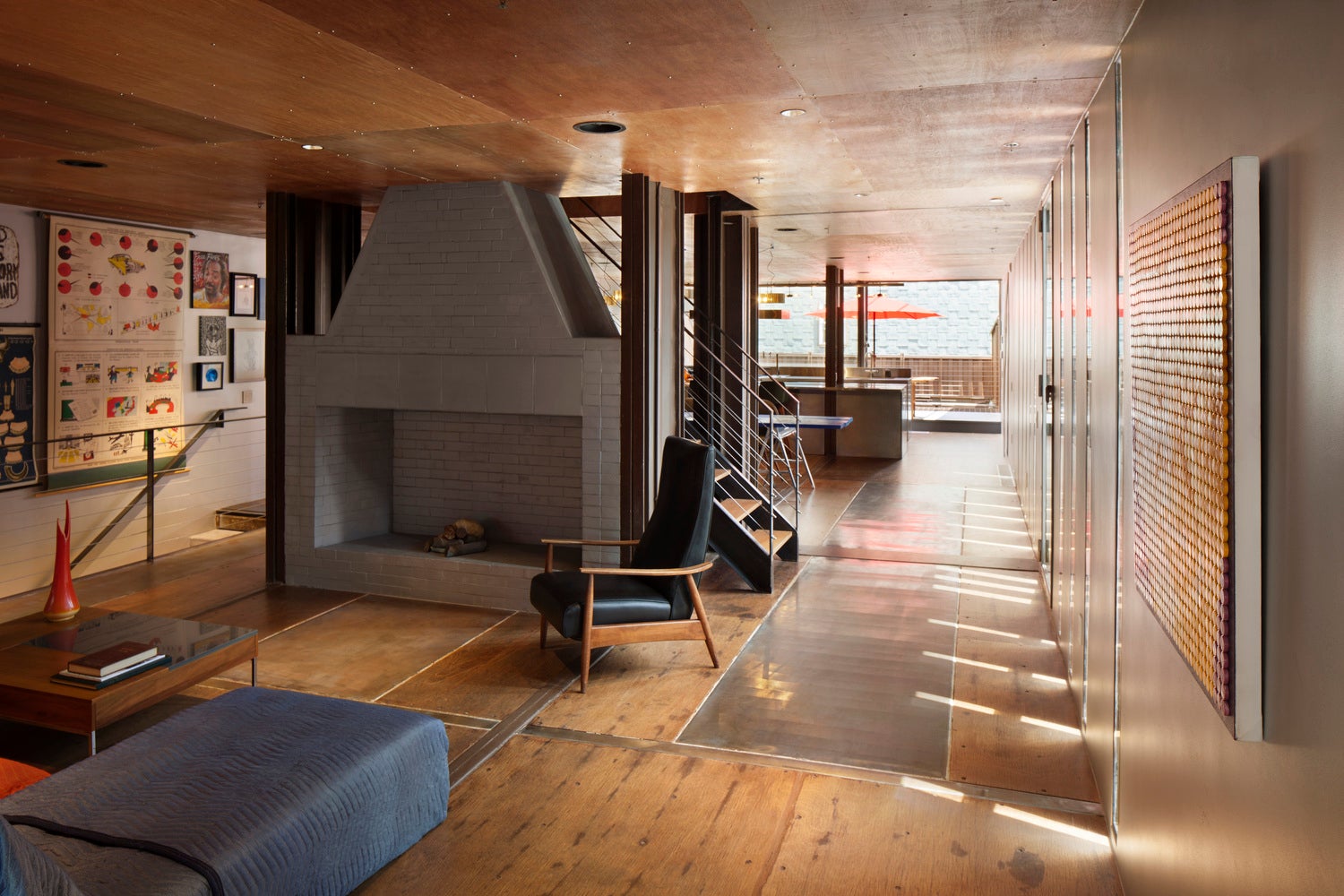 O corte diagonal modifica o tipo de pátio posterior convencional no térreo e gera espaços ao ar livre em cada nível. Ao mesmo tempo, as paredes ao longo do corte diagonal protegem o espaço exterior. As grandes folhas de vidro deslizantes integram o espaço interior e os decks fechados ao ar livre.
