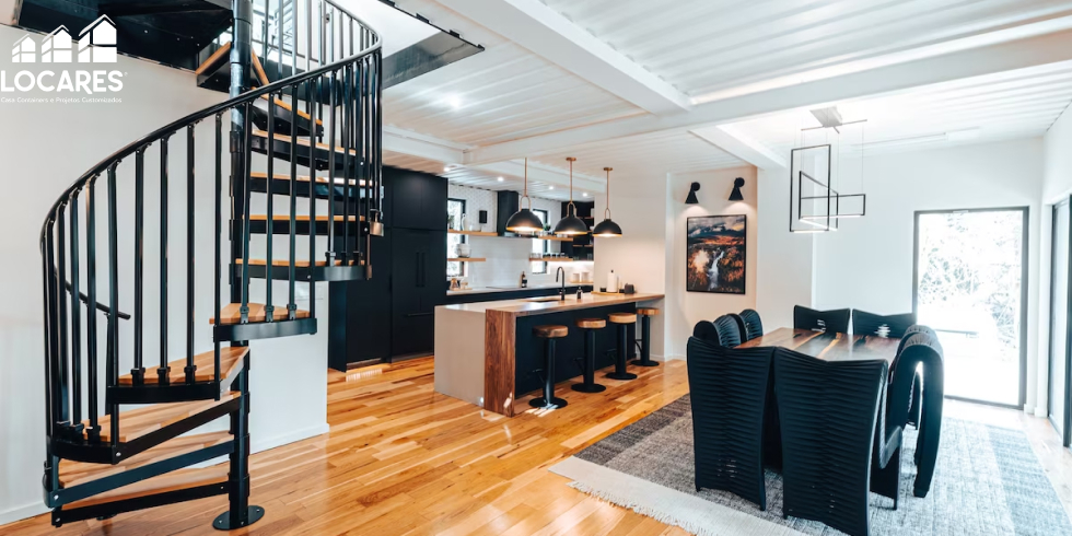 O interior da casa container, especialmente uma casa de férias e no meio da natureza, deve ser extremamente acolhedor e confortável. Os espaços cuidadosamente planejados para maximizar a funcionalidade, com uma cozinha moderna, sala de estar espaçosa e quartos confortáveis, toques de madeira e elementos naturais, tudo isso cria um contraste harmonioso com a estrutura metálica dos containers.