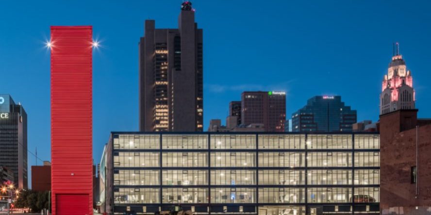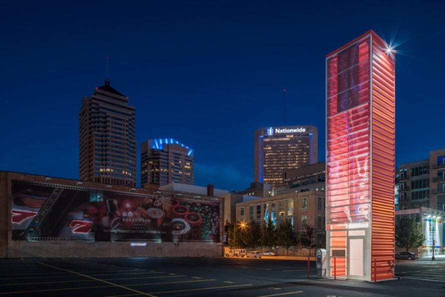 O container estacionamento instalado na cidade de Columbus, em Ohio funciona como uma cabine exclusiva para o armazenamento de veículos. A estrutura antiga foi reaproveitada e transformada em uma torre vermelha de 10 metros de altura que fornece um contraste impressionante, impossível não chamar a atenção das pessoas que por ali passam.