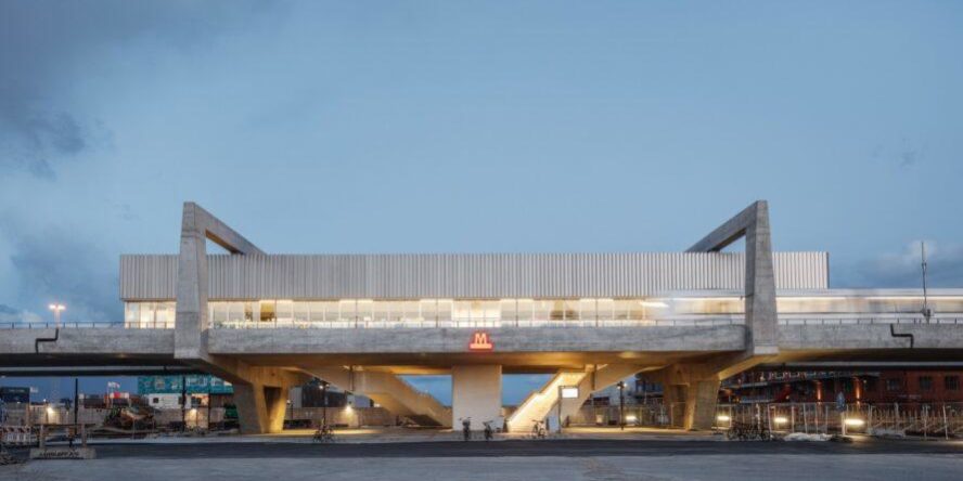 A estação de Orientkaj, no subsolo, foi inspirada no uso de containers de transporte como um aceno para os edifícios brutalistas e portuários de larga escala com construção quadrada de vidro, concreto e alumínio.